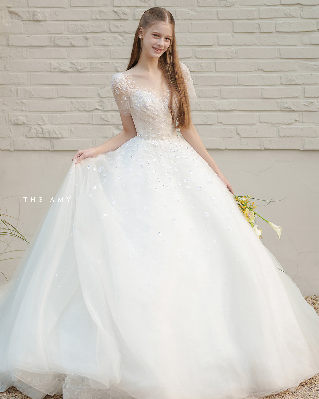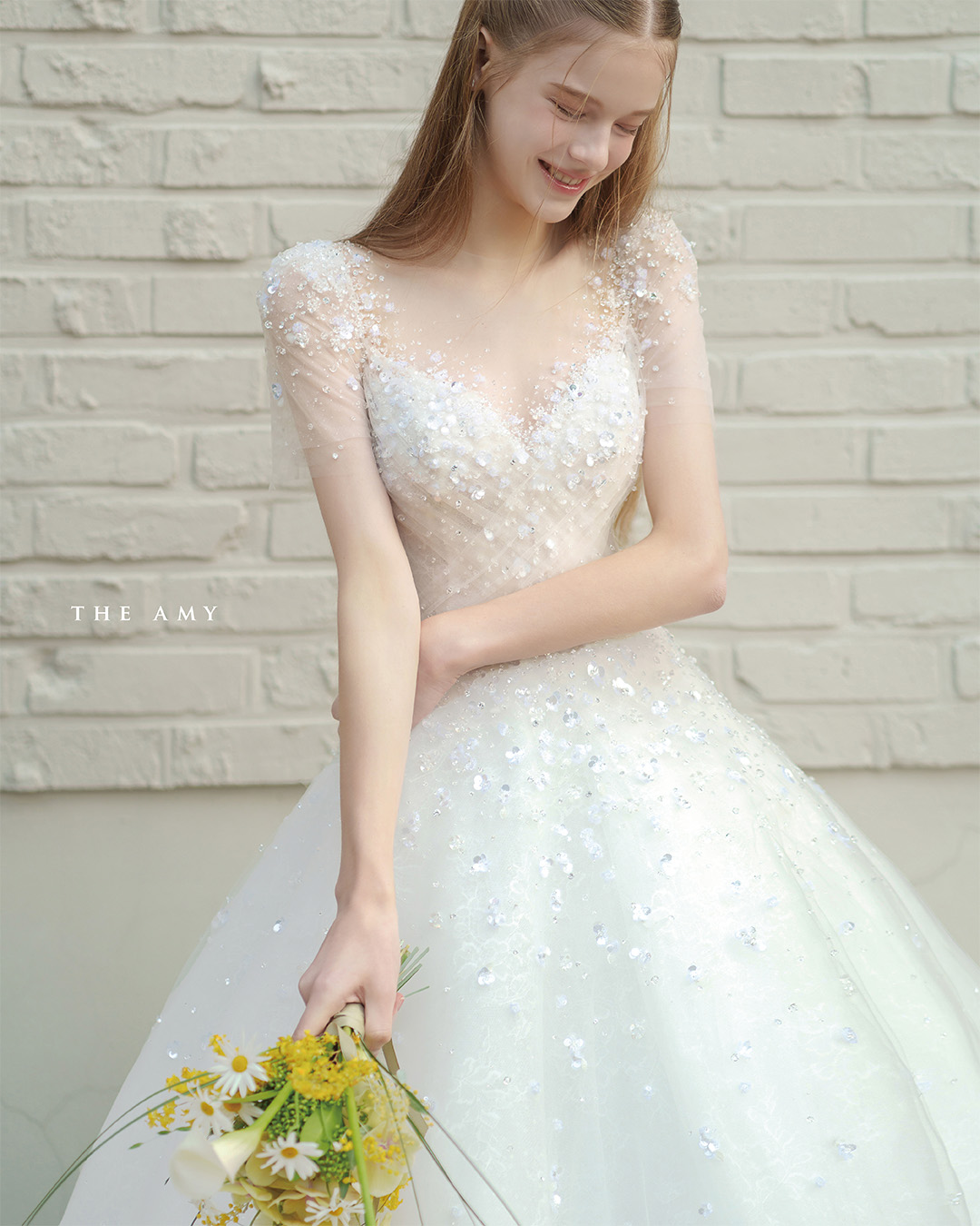 가벼운 튤 위에 더해진 러블리한 크리스탈 비딩이 전체 실루엣을 산뜻하게 감싸줍니다.