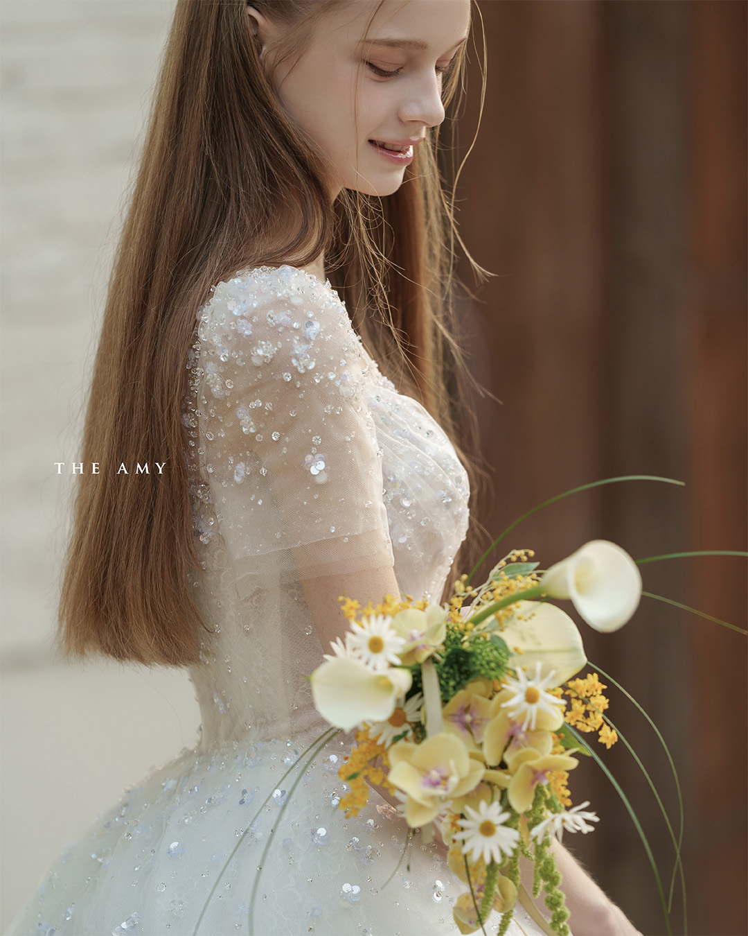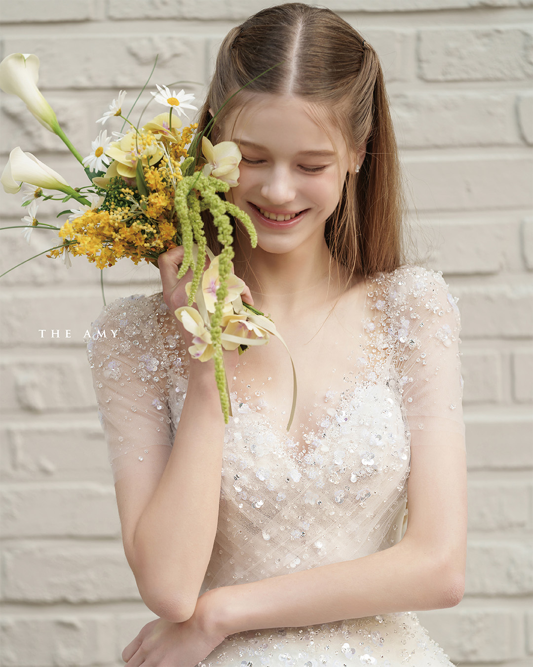 맑은 비즈가 은은하게 흩뿌려진 보디스가 빛을 머금은 듯 투명한 생기를 더하고,