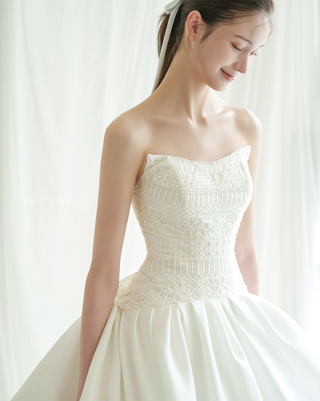 보디스 전체에 섬세하게 짜인 자수 레이스와 촘촘한 비즈 장식이 어우러져,
