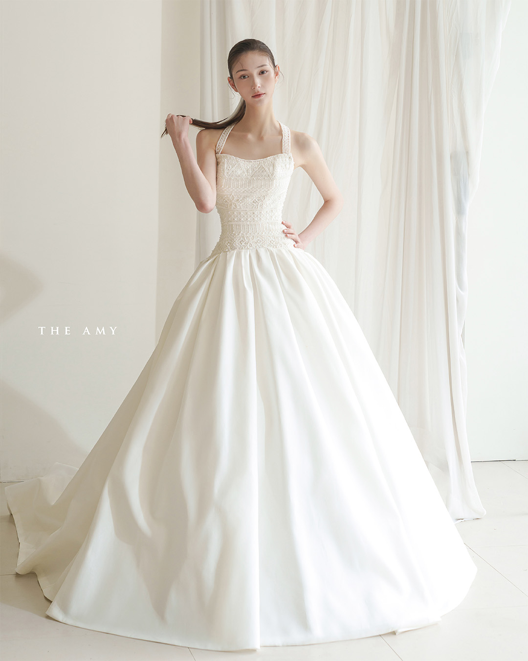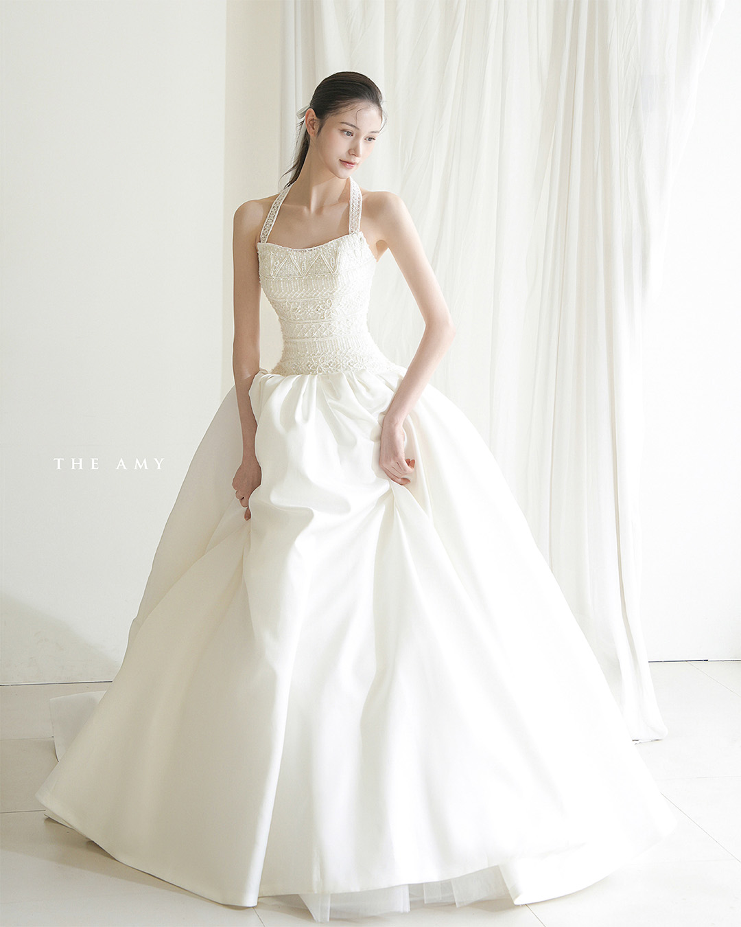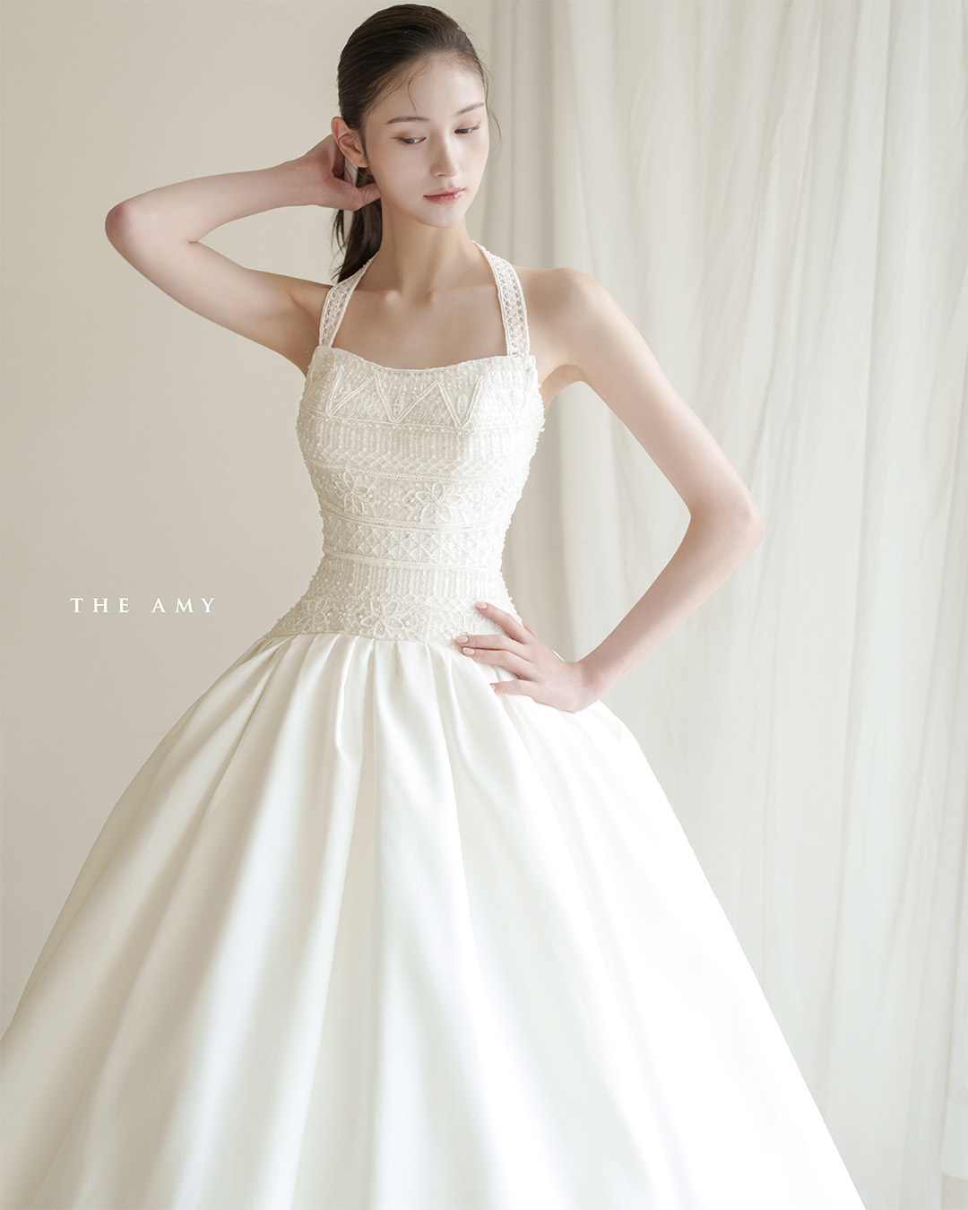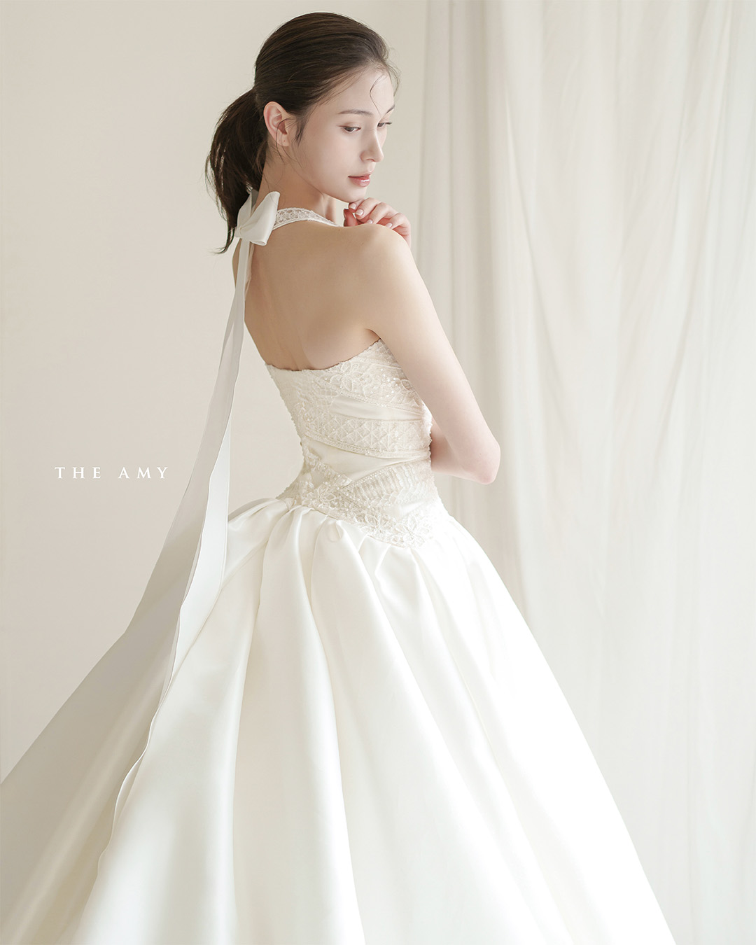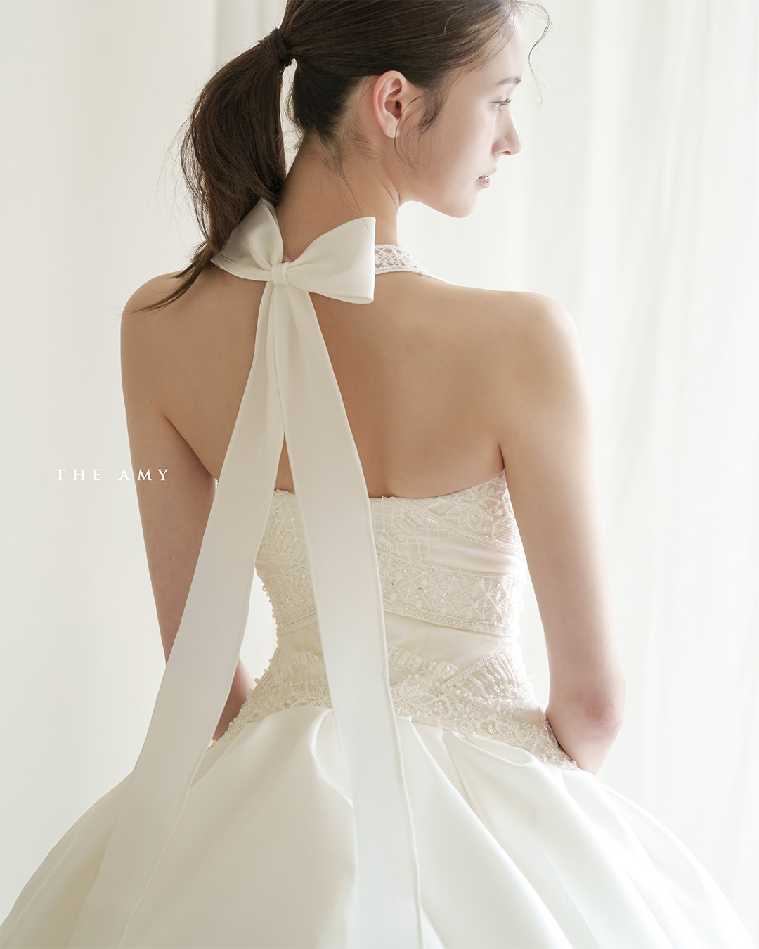 보디스 자수와 연결된 끈을 활용하여 홀터넥 스타일로의 변형 연출도 가능해 다양한 무드를 연출할 수 있습니다.