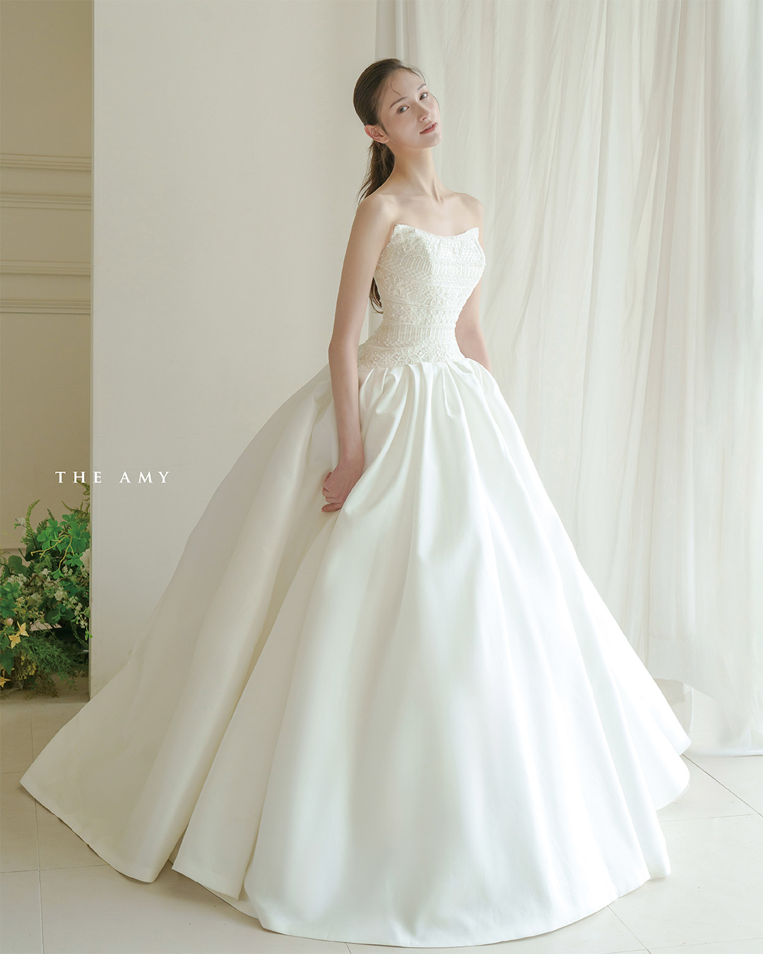 허리에서 부드러운 곡선을 그리며 흘러내리는 스커트가 상반신의 디테일을 한층 또렷하게 강조해 주며,
