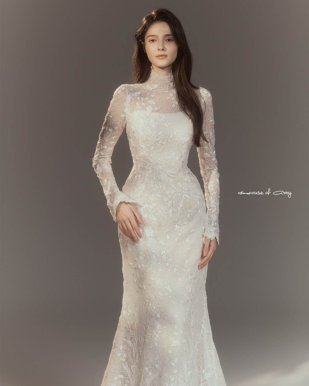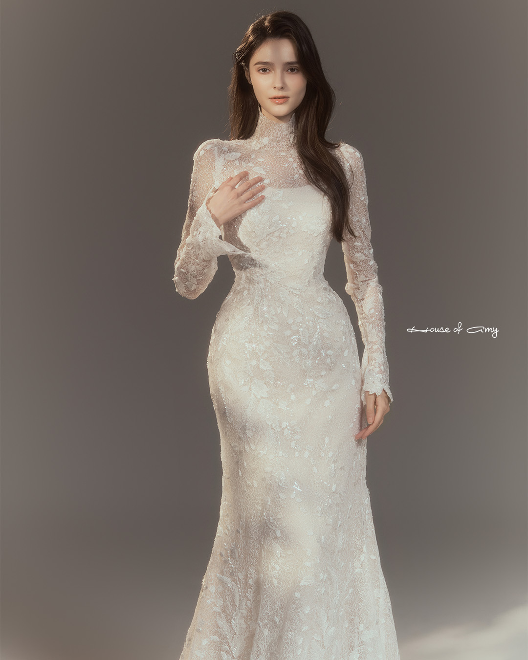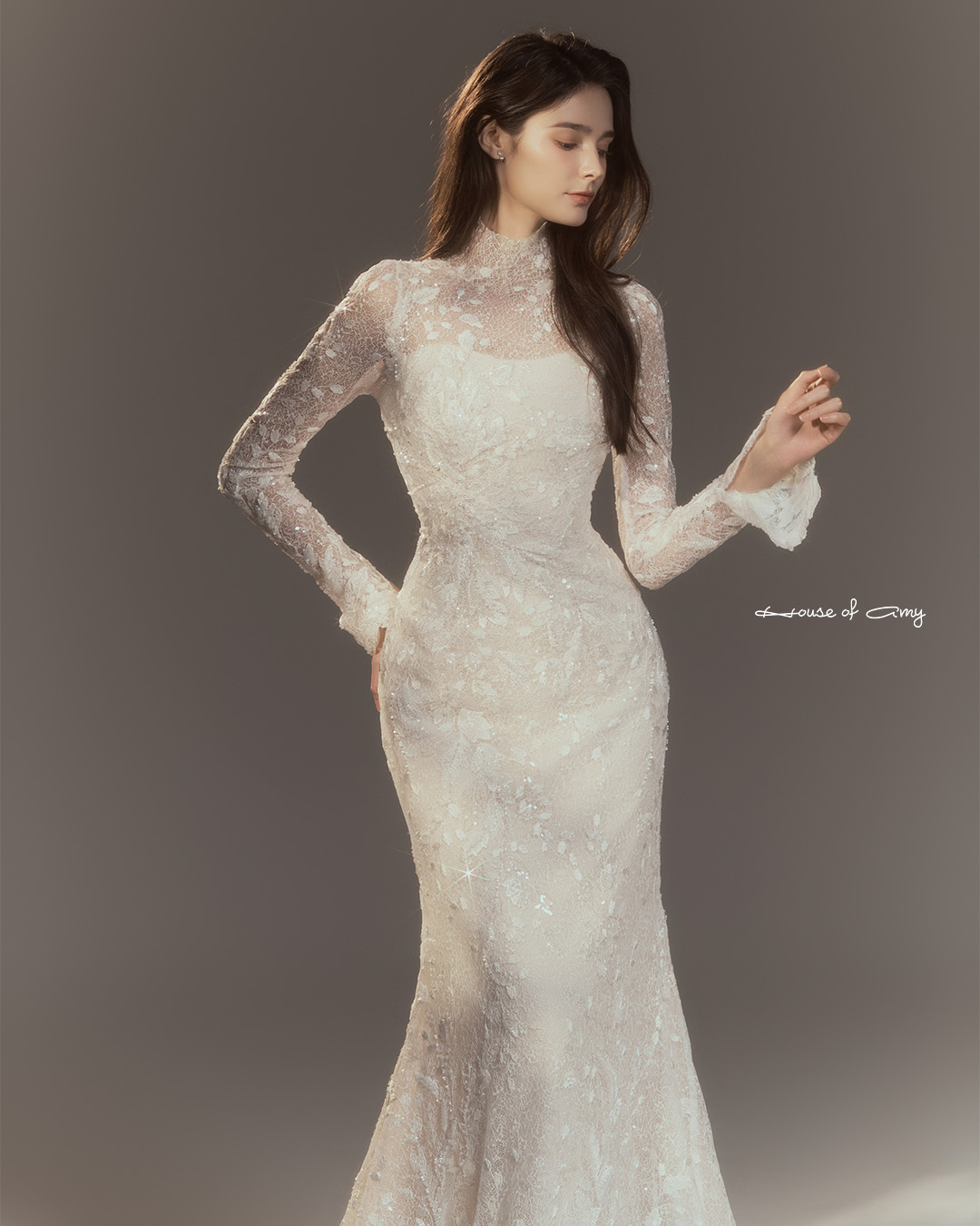 하이넥부터 손끝으로 이어지는 시스루 레이스 소매는 여성스러운 실루엣을 한층 더 우아하게 강조해줍니다.