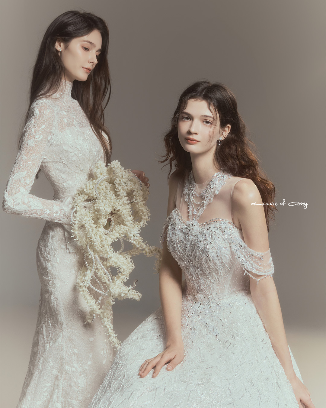 We overlap 3-6 fabrics to show classical and dreamlike colors of dresses which only can be found in the House of Amy.