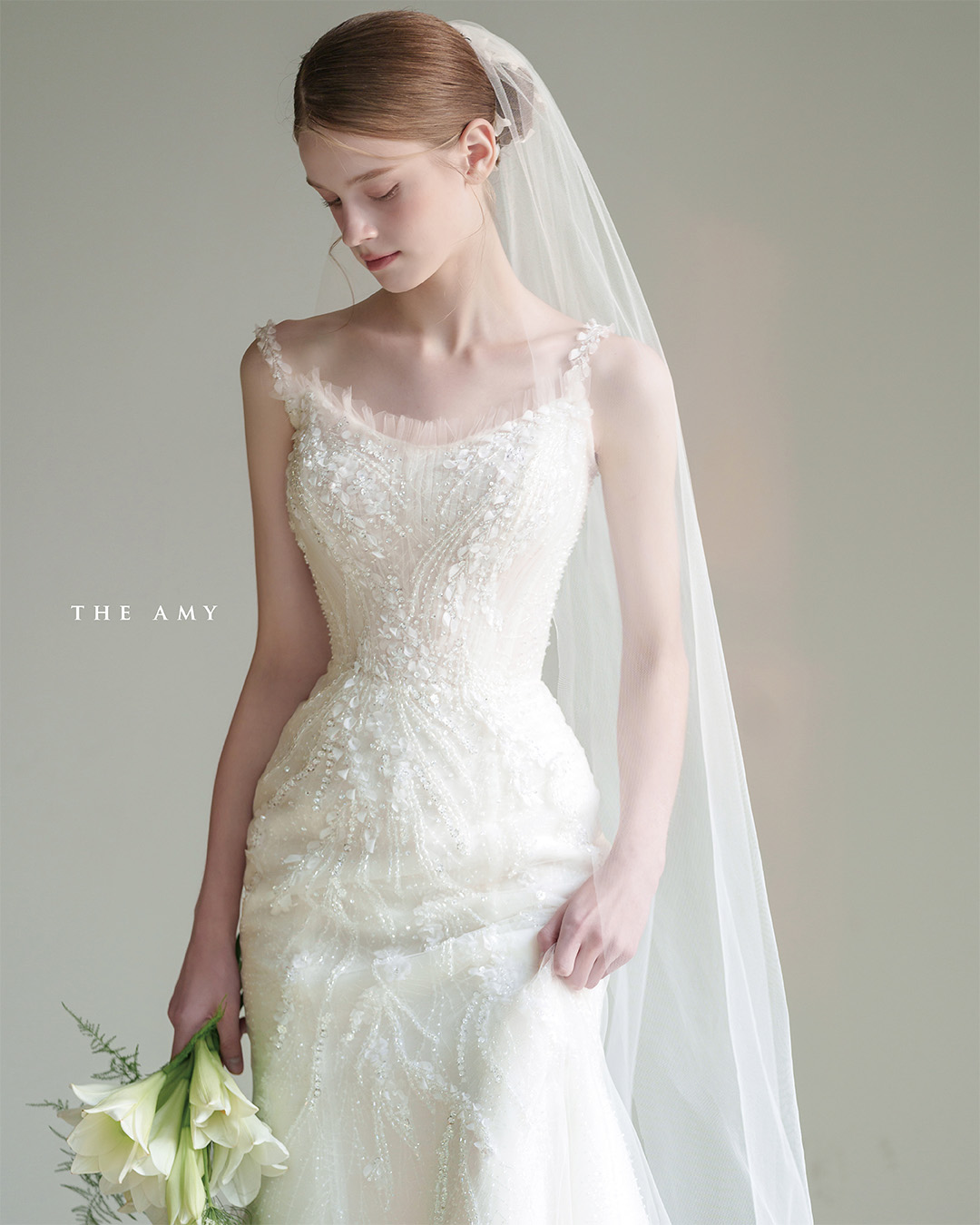 입체적인 자수 레이스 위에 은은하게 겹쳐진 튤이 부드러운 결을