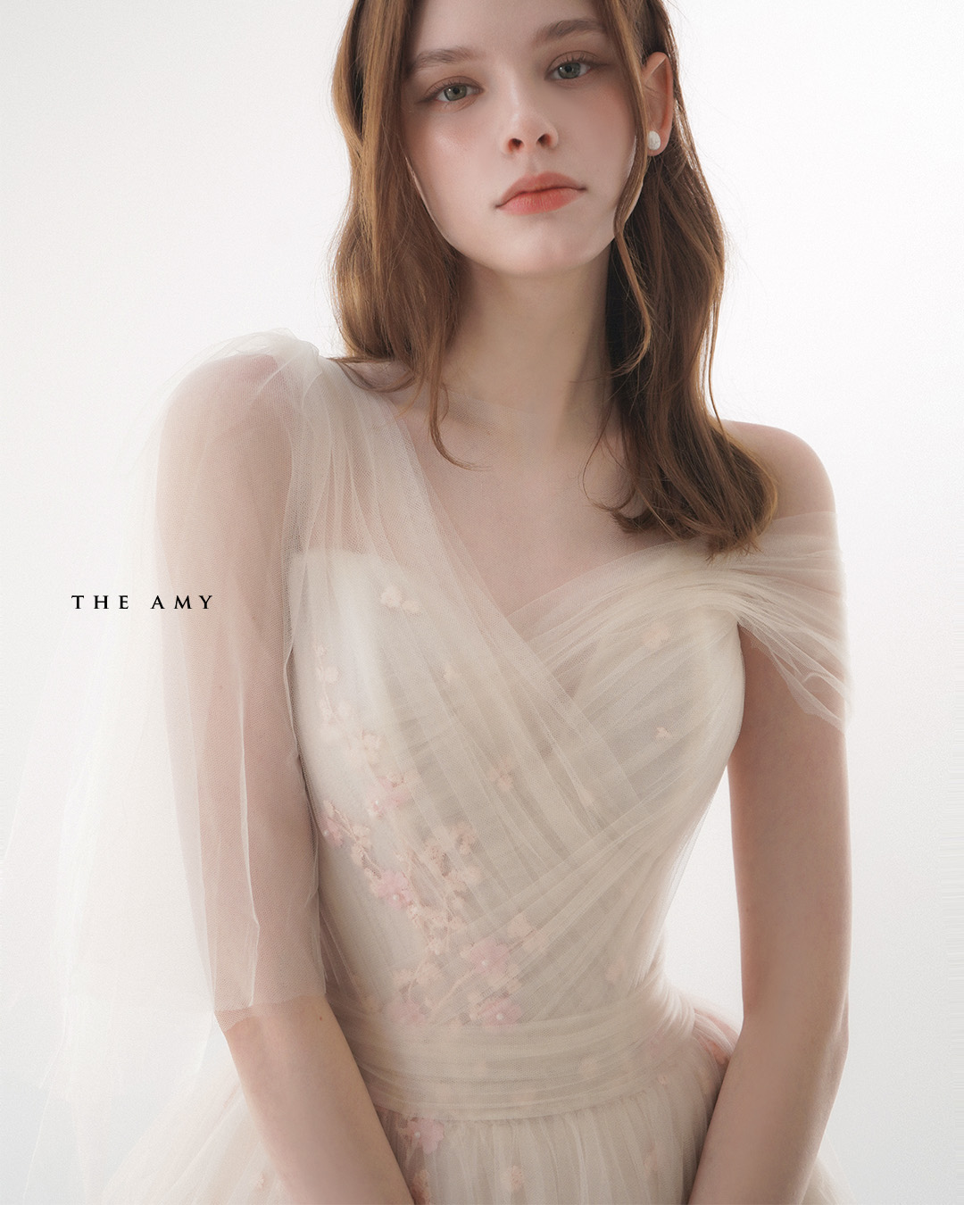 우아한 인상을 남기고, 반대쪽은 오프숄더 라인으로 드러나 균형감 있는 아름다움을 완성합니다.